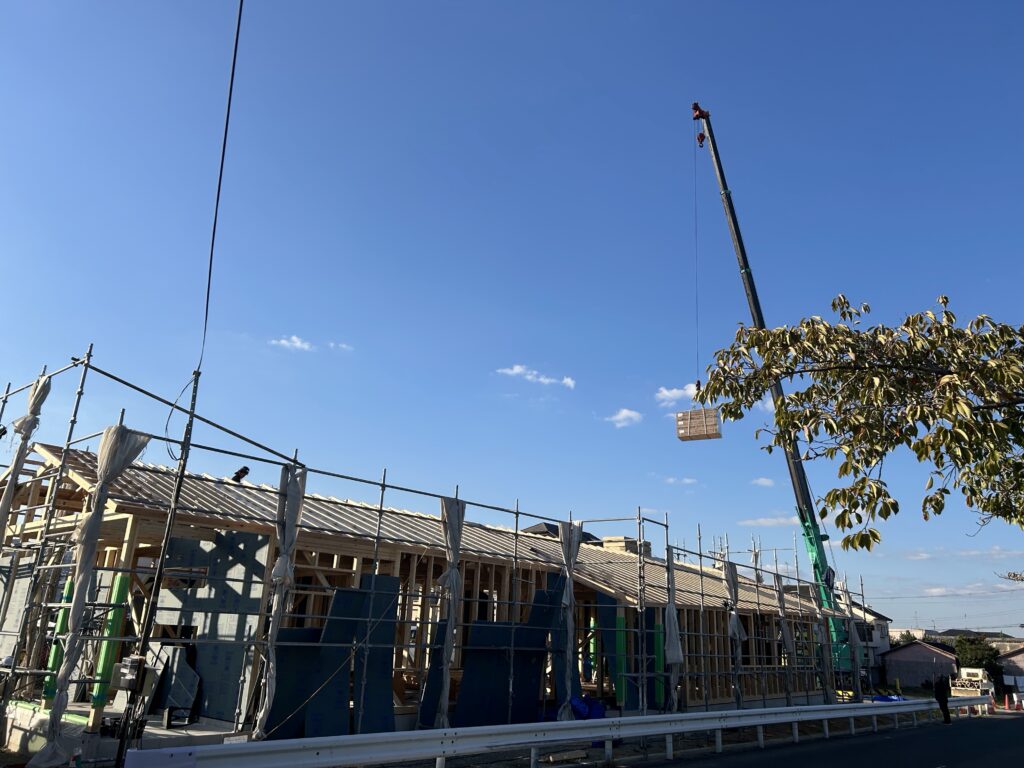 先日(2025.10.29)は新社屋の上棟の日でした。28日から2日にかけて、秋の気持ち良い晴天に恵まれ、無事に棟上げが行われました。