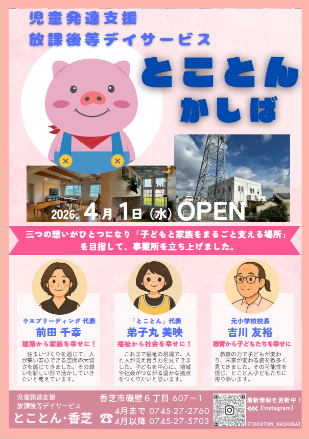 二つ目のお知らせで、現在香芝市磯壁にある本社ですが、来春の新社屋のオープンに伴い移転となるのですが、建物はそのままに、新しく児童発達支援・放課後デイサービス「とことん かしば」という事業所がオープンいたします。